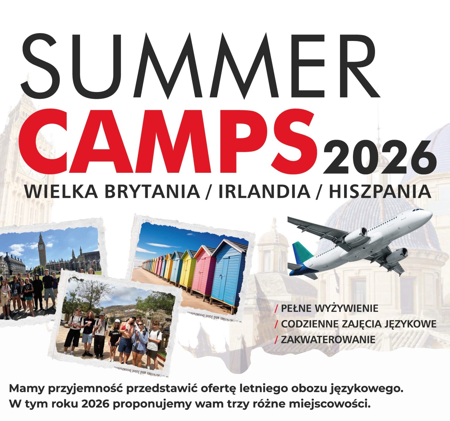 Szukasz wartościowego wyjazdu dla swojego dziecka na wakacje 2026? Połączenie nauki języka, podróży i niezapomnianych doświadczeń to najlepsza inwestycja w rozwój młodego człowieka. Summer Camps 2026 to wyjątkowa oferta obozów językowych w trzech atrakcyjnych kierunkach: Wielkiej Brytanii, Irlandii oraz Hiszpanii.